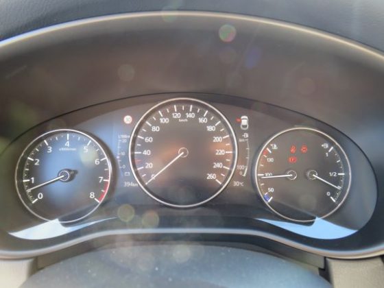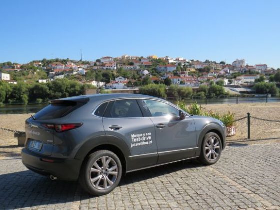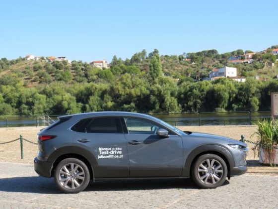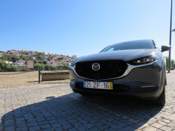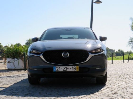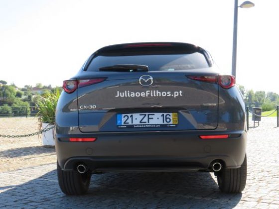 A parte dianteira é muito semelhante à do 3, com as óticas a inclinarem para baixo, fazendo parecer que o CX-30 está com “ar de mau” e, uma imponente grelha a preto brilhante com contornos a cromado. Na parte lateral temos umas jantes de 18 polegadas, como se trata de um SUV, umas pequenas proteções plásticas em volta das rodas e embaladeiras. A parte traseira, à semelhança do 3, tem um aspeto arredondado, as óticas são finas e alongadas e tem duas ponteiras de escape verdadeiras! Só achamos que para o tamanho do CX-30, a Mazda deveria ter aumentado o tamanho das mesmas, pois ficam a parecer muito pequenas.