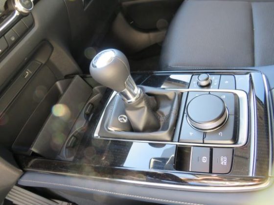 A qualidade dos materiais é excelente, típico da Mazda, que tem os melhores interiores do seu segmento. Há material suave com efeito pesponto no topo do tablier e, na parte central um revestimento em pele. Na consola central temos um plástico piano black que não fica muito sujo com as dedadas, e, em volta do mesmo temos um material suave com efeito pesponto. No topo das portas existe também material suave, os frisos são em pele com efeito pesponto e no descanso do cotovelo é em pele muito suave. No que toca às portas traseiras já perdemos um pouco de qualidade, não na parte central e encosto de cotovelo, mas na parte superior que é toda em plástico.
