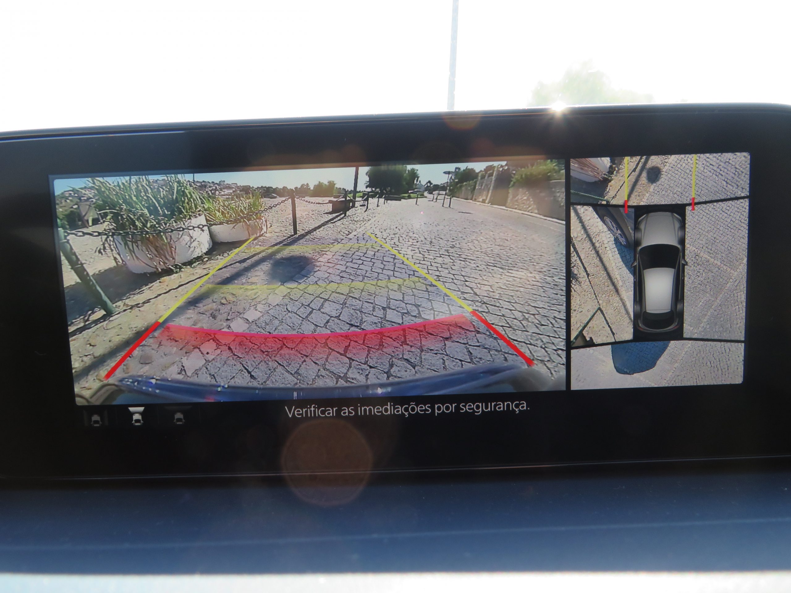 A parte dianteira é muito semelhante à do 3, com as óticas a inclinarem para baixo, fazendo parecer que o CX-30 está com “ar de mau” e, uma imponente grelha a preto brilhante com contornos a cromado. Na parte lateral temos umas jantes de 18 polegadas, como se trata de um SUV, umas pequenas proteções plásticas em volta das rodas e embaladeiras. A parte traseira, à semelhança do 3, tem um aspeto arredondado, as óticas são finas e alongadas e tem duas ponteiras de escape verdadeiras! Só achamos que para o tamanho do CX-30, a Mazda deveria ter aumentado o tamanho das mesmas, pois ficam a parecer muito pequenas.