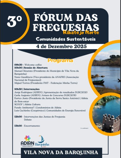 A ADIRN – Associação para o Desenvolvimento Integrado do Ribatejo Norte, em colaboração com a Câmara Municipal de Vila Nova da Barquinha, promove esta quinta-feira, 4 de dezembro, o 3.º Fórum das Freguesias do Ribatejo Norte, que terá como tema central “Comunidades Sustentáveis”. O encontro decorre no Centro Cultural de Vila Nova da Barquinha.