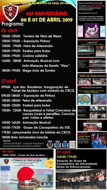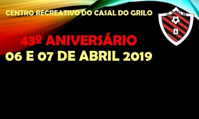 No fim de semana de 06 e 07 de abril de 2019 o Centro Recreativo do Casal do Grilo irá comemorar o seu 43º aniversário com um vasto leque de atividades que passam pelos campos cultural, recreativo, desportivo e de solidariedade. Estas atividades serão abertas a toda a comunidade e grátis.