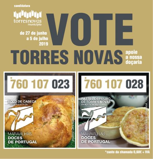 Decorre a partir de hoje e até 5 de julho o período de votação no Bolo de Cabeça e Pastel de Feijão de Torres Novas, doces que passaram à final distrital do concurso 7 Maravilhas Doces de Portugal®. De 27 de junho a 5 de julho todos os interessados poderão votar no Bolo de Cabeça através do número 760 107 023 e no Pastel de Feijão de Torres Novas através do número 760 107 028. As chamadas têm o custo de 0,60€ + IVA.