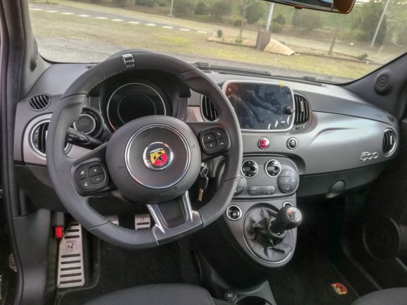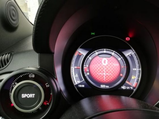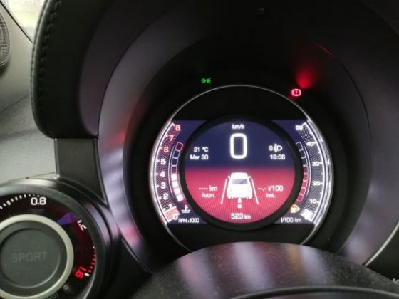O sistema de infotaiment não é dos melhores, os gráficos e a velocidade de processamento não surpreendem muito e o seu tamanho é pequeno para os dias de hoje, pois são de apenas 7 polegadas. No entanto é intuitivo e tem alguns aspetos interessantes. Por exemplo, quando ligamos o carro aparece-nos uma imagem do Abarth a deixar a garagem e quando desligamos o Abarth a entrar na garagem, até parece que estávamos a jogar Gran Turismo! Temos ainda a aplicação Abarth Telemetry que é direcionada para circuito, onde numa volta de reconhecimento o computador vai desenhar a pista e depois irá contar o nosso tempo por volta e, consoante a nossa prestação podemos ganhar emblemas como troféus, mais uma vez parece que estamos a jogar Gran Turismo. A aplicação já tem alguns circuitos mundialmente conhecidos como predefinição, e caso tenhamos Apple Carplay ou Android Auto é nos possível partilhar os nossos resultados. Temos ainda um painel de instrumentos digital, mas é muito básico apenas troca o seu aspeto se trocarmos do modo normal para o modo Sport, e mostra informações como os consumos, autonomia, as ajudas de condução ativas, etc.