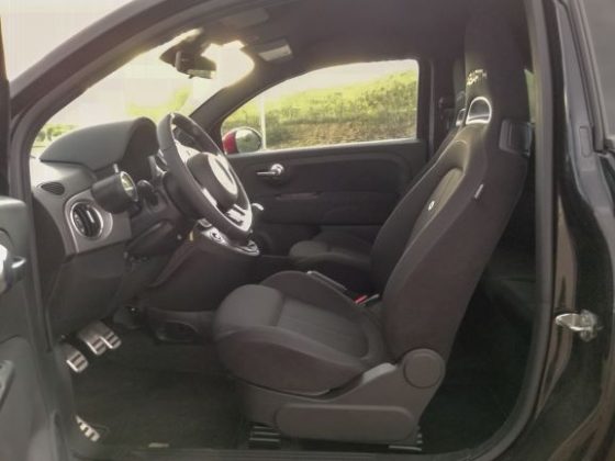 O design interior é muito igual ao do 500, até no tablier no lado do pendura temos o logótipo 500, que na nossa opinião podia ter sido trocado pelo 595, um detalhe que o tornaria mais especial. As únicas diferenças do 595 para o 500 são as baquets desportivas, um volante desportivo e um pequeno manómetro “Sport” com a indicação dos bar. A qualidade de construção é razoável, existe alguns elementos que não estão tão bem montados e os materiais são na sua generalidade plástico, com a exceção de um material suave com efeito pesponto na cobertura dos manómetros. Achamos que poderia haver mais detalhes que tornassem o 595 mais diferenciado e justificassem o preço. As baquets têm um bom encosto e a habitabilidade para os passageiros da frente é boa, no entanto na parte de trás apenas se recomenda o transporte de crianças.