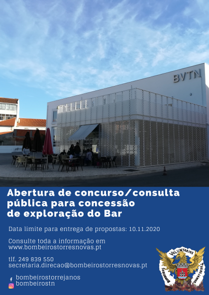 Encontra-se aberto concurso para concessão de exploração do Bar dos Bombeiros Voluntários Torrejanos, sito na Av. dos Bombeiros Voluntários, em Torres Novas.