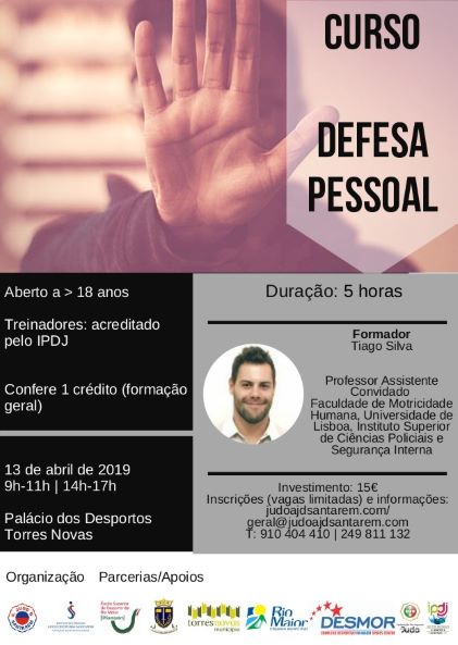 A Associação de Judo do Distrito de Santarém organiza um Curso de Defesa Pessoal, com a duração de 5 horas, no dia 13 de abril, das 9h às 11h e das 14h às 17h, no Palácio dos Desportos, em Torres Novas.