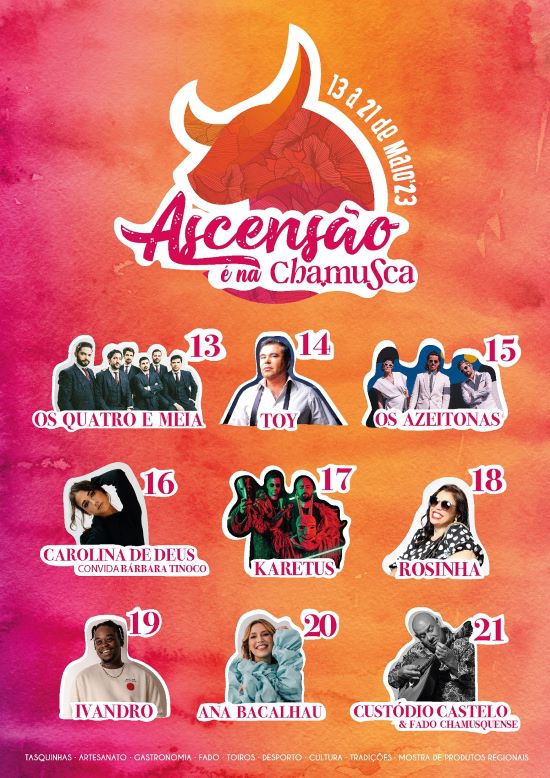 A festa arranca com o grande concerto de Os Quatro e Meia, no palco principal, segue-se Toy com um concerto Interativo, onde cabe ao público a tarefa de decidir a música que o artista vai cantar (14 de maio), Os Azeitonas (15 de maio), Carolina de Deus com Bárbara Tinoco como convidada (16 de maio), Karetus (17 de maio), Rosinha (18 de maio), Ivandro (19 maio) e Ana Bacalhau (20 de maio). O grande espetáculo de fado Chamusquense com Custódio Castelo (21 de maio) fecha a maior semana de cultura e tradição do Concelho da Chamusca.