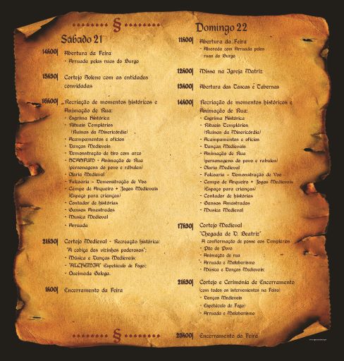 O programa, que tem os seus pontos altos nos cortejos com recriação histórica (“A cobiça dos vizinhos poderosos” às 21h30 de sábado e “Chegada de D. Beatriz e a confirmação de posse aos Templários” no domingo às 17h30), inclui arruadas, recriações de momentos históricos, animação de rua, esgrima histórica, rituais templários, acampamentos e ofícios, danças medievais, demonstração de tiro com arco, olaria medieval, falcoaria, jogos medievais, contador de histórias, gansos amestrados, música medieval e espetáculo de fogo. Haverá ainda demonstração de armas, exposição de aves, quinta medieval e mercado medieval com artesãos e mercadores, tascas e tabernas.