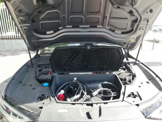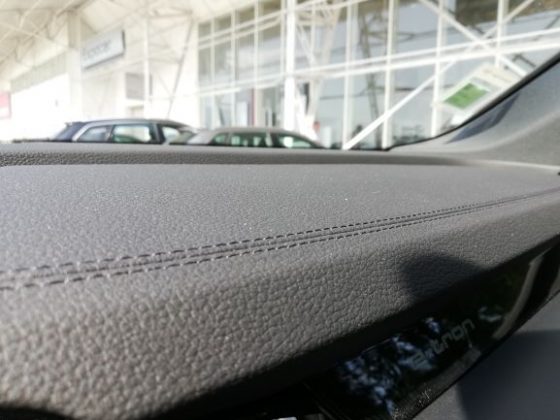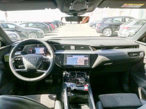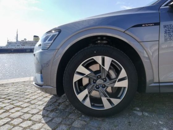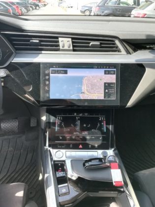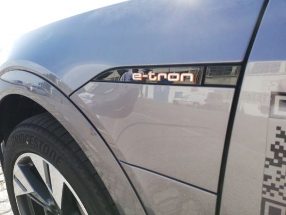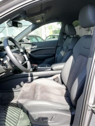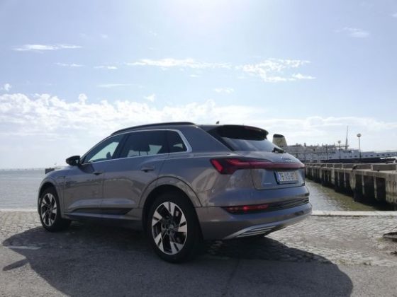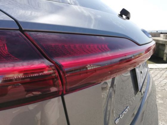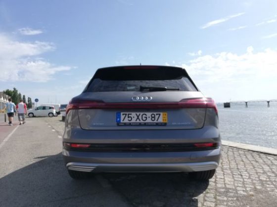 Na parte dianteira é de salientar a ausência da típica frente de um automóvel elétrico, completamente lisa e fechada. Existe sim, uma grelha com o típico formato da Audi, a qual não está totalmente fechada e que tem um certo relevo para apresentar um aspeto mais semelhante ao dos veículos normais. As óticas são muito semelhantes às do Q8 e, existe uma entrada de ar nas extremidades do para-choques para arrefecimento dos travões e aerodinâmica. Na parte lateral temos uma silhueta também semelhante à do Q8, mas com pormenores que o “tornam elétrico”, como é o caso das jantes de 20 polegadas que são mais fechadas que o normal, o que permite diminuir a resistência ao vento. Existe ainda, quer do lado esquerdo quer do lado direito, uma porta automática para os pontos de carregamento com a inscrição “e-tron” a laranja por cima. Foi uma excelente ideia da Audi colocar nos dois lados, pois isso significa que não precisamos de andar em manobras em concordância com a posição do posto de carregamento. No que diz respeito à parte traseira, esta também é um pouco semelhante à do Q8, nomeadamente as óticas, que apresentam a faixa vermelha ao longo da bagageira, a qual tem vindo a ser introduzida pela Audi nos seus novos modelos, como é o caso do novo A7, A8 e Q8. Temos ainda um difusor que nas suas extremidades tem uns relevos que simulam umas ponteiras de escape.