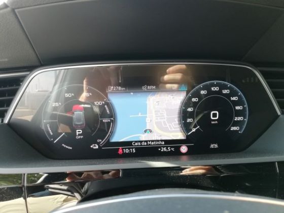 O E-Tron é bastante económico. Fizemos um percurso entre 35 a 40 km, com um misto de condução calma e desportiva, em vários cenários (urbano, estrada nacional e autoestrada), sempre com o ar condicionado ligado. Quando arrancamos tínhamos autonomia para 290 km e à chegada tínhamos autonomia para 271 km.