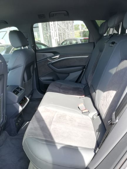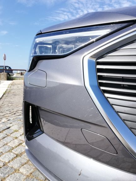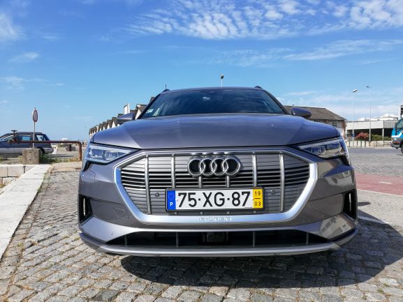 Na parte dianteira é de salientar a ausência da típica frente de um automóvel elétrico, completamente lisa e fechada. Existe sim, uma grelha com o típico formato da Audi, a qual não está totalmente fechada e que tem um certo relevo para apresentar um aspeto mais semelhante ao dos veículos normais. As óticas são muito semelhantes às do Q8 e, existe uma entrada de ar nas extremidades do para-choques para arrefecimento dos travões e aerodinâmica. Na parte lateral temos uma silhueta também semelhante à do Q8, mas com pormenores que o “tornam elétrico”, como é o caso das jantes de 20 polegadas que são mais fechadas que o normal, o que permite diminuir a resistência ao vento. Existe ainda, quer do lado esquerdo quer do lado direito, uma porta automática para os pontos de carregamento com a inscrição “e-tron” a laranja por cima. Foi uma excelente ideia da Audi colocar nos dois lados, pois isso significa que não precisamos de andar em manobras em concordância com a posição do posto de carregamento. No que diz respeito à parte traseira, esta também é um pouco semelhante à do Q8, nomeadamente as óticas, que apresentam a faixa vermelha ao longo da bagageira, a qual tem vindo a ser introduzida pela Audi nos seus novos modelos, como é o caso do novo A7, A8 e Q8. Temos ainda um difusor que nas suas extremidades tem uns relevos que simulam umas ponteiras de escape.