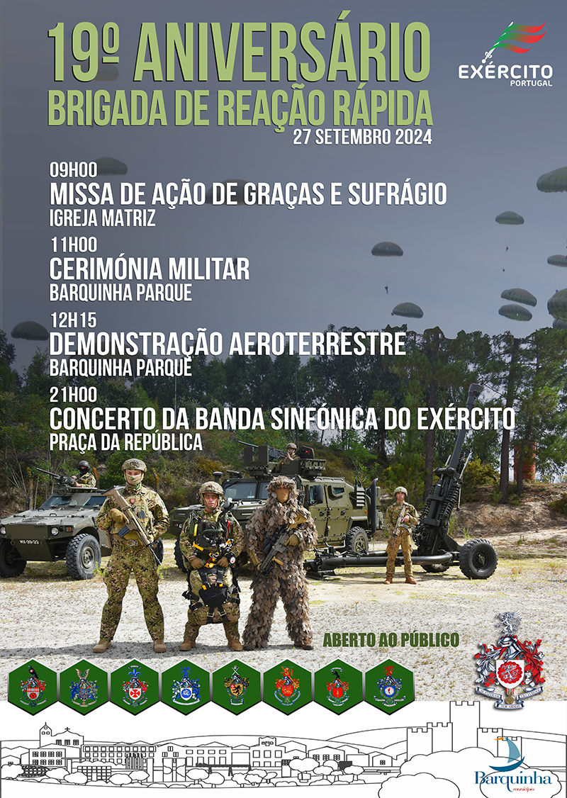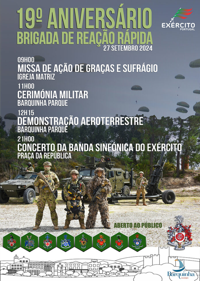 A Brigada de Reação Rápida (BrigRR), unidade de elite do Exército Português, celebra o seu 19.º aniversário no dia 27 de setembro de 2024, em Vila Nova da Barquinha. Esta unidade, que ao longo dos anos tem desempenhado um papel crucial na defesa nacional e em missões internacionais de manutenção da paz, convida a comunidade local a juntar-se às celebrações.