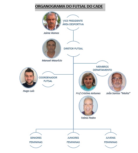 A estrutura do Futsal está definida: um Diretor para o Futsal – MANUEL MAURICIO, que reportará diretamente ao Vice-Presidente para a área Desportiva – JAIME RAMOS, um Coordenador para o Futsal – HUGO LUÍS, um Departamento de Futsal, constituído por vários elementos que ajudarão o Diretor do Futsal a dirigir todo o Futsal das Equipas do CADE e pelas Equipas Técnicas das Equipas, que oportunamente serão apresentadas, assim que elas estejam completas.