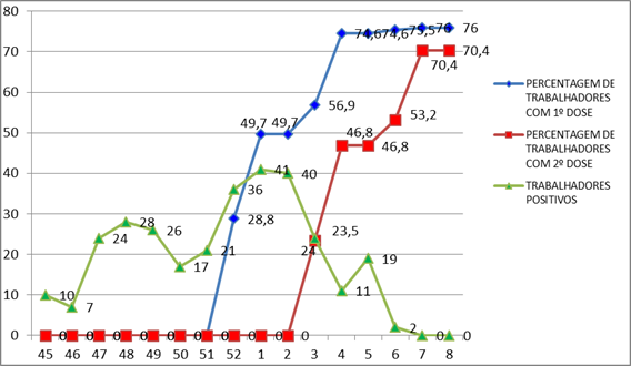 Pode verificar-se que à medida que se foi avançando na percentagem de vacinados, o número de casos de profissionais com Covi-19 diminuiu até ao valor de 0, tendo deixado de haver casos Covid-19 na 7ª semana de 2021, altura em que 70,40% dos profissionais do CHMT tinham o esquema vacinal contra a Covid-19 completo.
