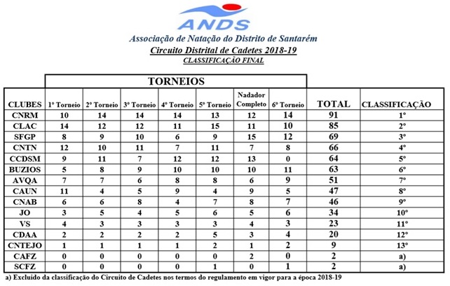 A equipa vencedora foi a Equipa do Clube Natação de Rio Maior, que merecidamente venceu este circuito 2018-2019. Este derradeiro torneio que tinha a particularidade de haver provas longas de fundo e meio fundo e provas de 200 metros, a equipa do CLAC fez-se representar pelos seguintes nadadores: