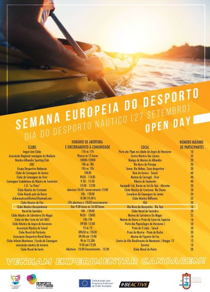 O Clube Náutico Barquinhense irá participar na Semana Europeia do Desporto, onde no dia 27 de setembro será o OPEN DAY – Dia do Desporto Náutico, e convida toda a comunidade a visitá-los das 9.30 às 12.30h e das 15.00 às 17.00h para praticarem um pouco de canoagem. Haverá monitores para acompanhar aqueles com menos experiência.