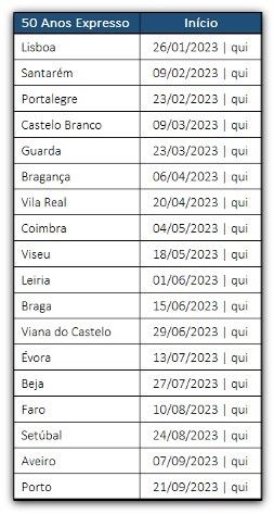 A partir do dia 26 de janeiro, o EXPRESSO irá percorrer o país, de norte a sul, numa ação de proximidade com os seus leitores, para celebrar os 50 anos de vida do jornal. Durante duas semanas em cada uma das cidades, haverá uma exposição interativa com as melhores capas de cada um destes 50 anos em que o EXPRESSO fez parte da vida dos portugueses. Cada uma das capas será acompanhada de um QR Code, onde os visitantes podem descarregar as histórias de cada um destes 50 anos, em formato audioguia ou ouvir no podcast especial 50 anos do EXPRESSO.