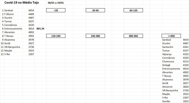 O concelho do Entroncamento, subiu a incidência cumulativa a 14 dias (06/01 a 19/01) de 3585 para 4014 (por 100 mil habitantes) continuando no grupo de maior risco (>=960) e ocupando o quinto lugar dos concelhos de maior risco da região do médio Tejo, segundo os números divulgados pela DGS. O índice corresponde a 865 novos casos de doentes infetados com Covid-19, nos últimos 14 dias.