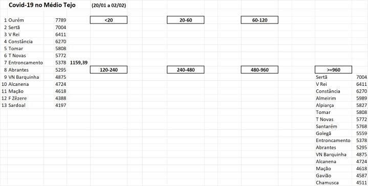 Dos treze concelhos do médio Tejo, o Entroncamento é o sétimo concelho de maior risco com uma incidência de 5378, nos últimos 14 dias (20/01 a 02/02) por 100 mil habitantes, a seguir a Ourém (7789), Sertã (7004), Vila de Rei (6411), Constância (6270), Tomar (5808), Torres Novas (5772), seguido de Abrantes (5295), Vila Nova da Barquinha (4875), Alcanena (4724), Mação (4618), Ferreira do Zêzere (4388), Sardoal (4197).
