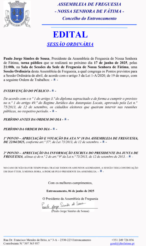 Início Publicidade Institucional Edital da Assembleia de Freguesia de N.ª Sra. de Fátima Publicidade Institucional Edital da Assembleia de Freguesia de N.ª Sra. de Fátima 10 Junho, 2025 2262 0 PUB PUB PUB ARTIGOS RELACIONADOSMais do autor Info Institucional: Convocatória para Assembleia Geral Ordinária do CERE Info Institucional: COFERPOR convoca Assembleia Geral Ordinária para 16 de dezembro Edital da Câmara Municipal do Entroncamento