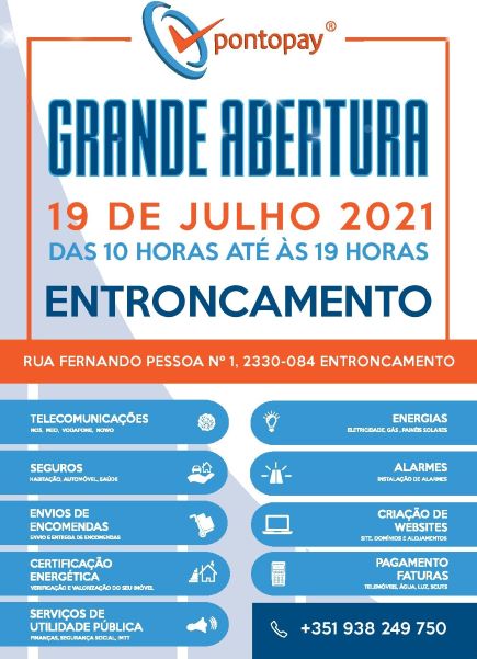 Esta segunda-feira abriu a Pontopay na Rua Fernando Pessoa, nº1 no Entroncamento. Trata-se de uma loja onde pode tratar de quase tudo, desde Telecomunicações, Seguros, Envios de Encomendas, Certificação energética, Energias, Alarmes, Criação de websites e Pagamento de faturas.