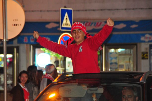 Assim que terminou o jogo no Estádio da Luz, em que o Benfica venceu o Santa Clara por 4-1, dezenas de adeptos do Benfica vieram para a rua a pé ou nas suas viaturas para festejarem ruidosamente o título de campeão nacional de futebol.