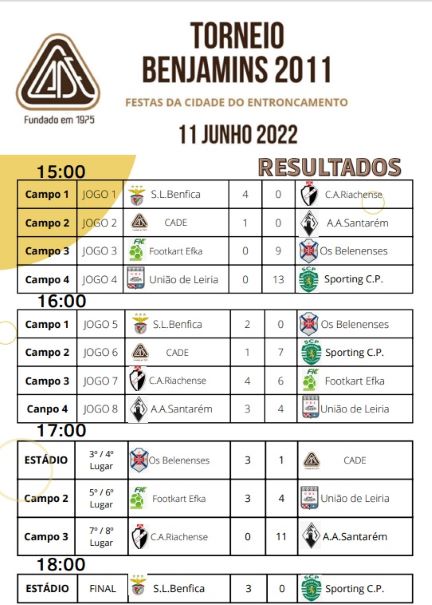 O Torneio Benjamins 2011, organizado pelo CADE realizou-se este sábado, dia 11 de junho no complexo desportivo do Bonito, no Entroncamento e foi ganho pelo Benfica que venceu o Sporting por 3-0 na final.