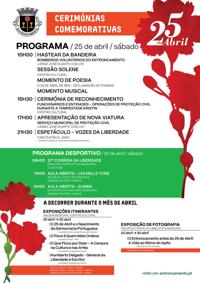 O Município do Entroncamento vai assinalar o 25 de Abril de 1974 com um programa comemorativo diversificado, que inclui cerimónias oficiais, momentos culturais, atividades desportivas e várias exposições dedicadas à Revolução dos Cravos. As iniciativas decorrem ao longo do dia 25 e estendem‑se durante o mês de abril, convidando toda a população a participar.