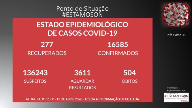 A nível nacional o número de mortos subiu para 504, mais 34 do que ontem (anteriormente mais 35), os infetados são agora 16585 mais 598 que ontem (anteriormente mais 515 ) e os casos recuperados são agora 277.