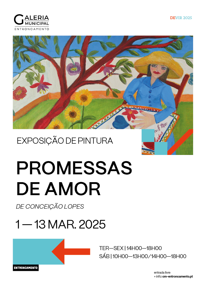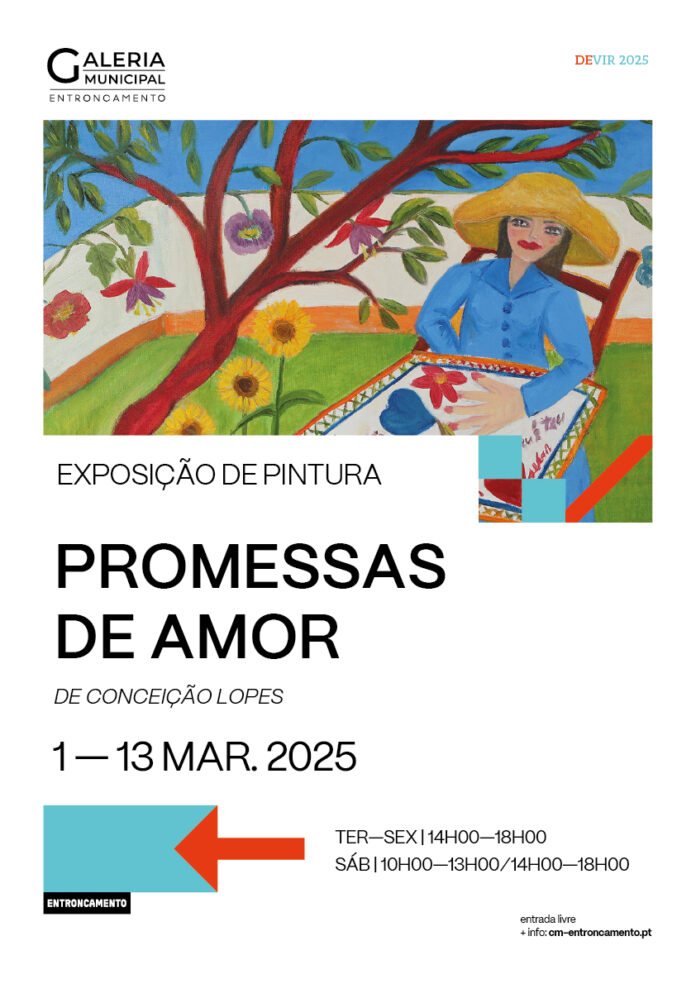 A Exposição de Pintura “Promessas de Amor”, integra o projeto DEVIR 2025 e tem inauguração marcada para dia 1 de março, sábado, pelas 17h00, podendo posteriormente ser visitada, até ao dia 13 de março, de terça a sexta-feira, entre as 14h00 e as 18h00 e ao sábado das 10h00 às 13h00 e das 14h00 às 18h00.