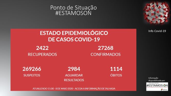 A nível nacional o número de mortos subiu para 1114, mais 9 do que ontem (anteriormente mais 16), os infetados são agora 27268, mais 553 do que ontem (anteriormente mais 533) e os casos recuperados são agora 2422, mais 164 do que ontem (anteriormente mais 182).