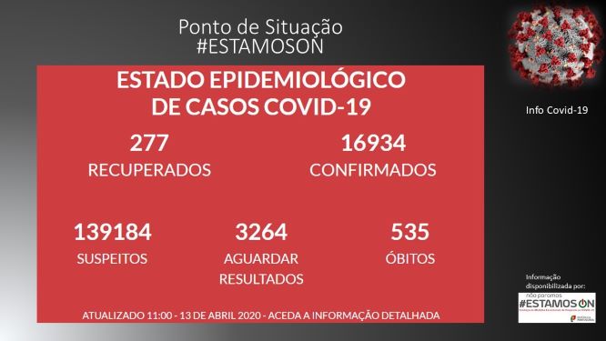 A nível nacional o número de mortos subiu para 535, mais 31 do que ontem (anteriormente mais 34), os infetados são agora 16934 mais 349 que ontem (anteriormente mais 598) e os casos recuperados mantém-se nos 277.