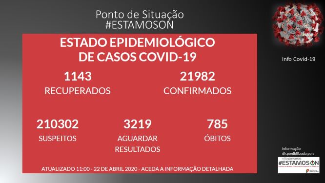 A nível nacional o número de mortos subiu para 785, mais 23 do que ontem (anteriormente mais 48), os infetados são agora 21982 mais 603 que ontem (anteriormente mais 1173) e os casos recuperados são agora 1143, mais 226.