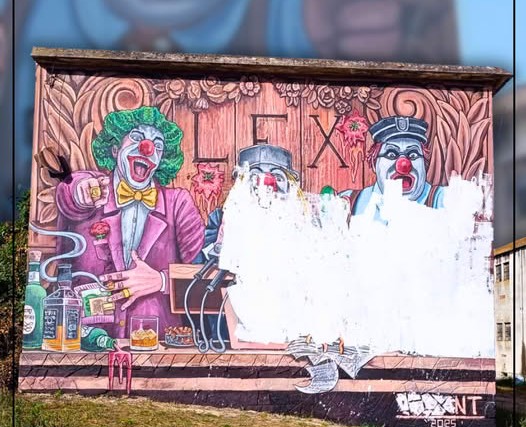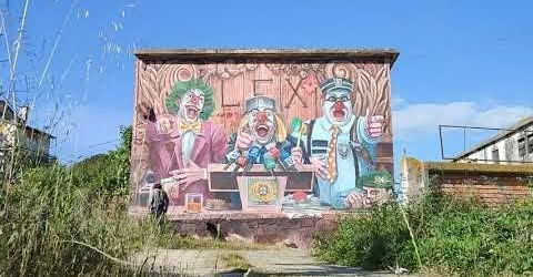 A pintura mural de João Maurício, de nome artístico Violant, erigida numa antiga fábrica no Entroncamento a caminho de Torres Novas, ilustra três personagens, um deles um agente da autoridade, vestidos e maquilhados de palhaços num cenário que parece ser a Assembleia da República, com microfones dos órgãos de comunicação e a inscrição LEX atrás das figuras.