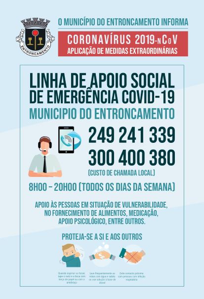 A Câmara Municipal do Entroncamento criou a Linha de apoio social com dois números de telefone disponíveis, 249 241 339 e 300 400 380 (custo chamada local), destinada aqueles que habitam no concelho e precisam de ajuda, idosos, pessoas com deficiência e famílias, em situação de maior vulnerabilidade,quer seja para a ida à Farmácia, quer para a aquisição de bens alimentares essenciais, quer mesmo para o fornecimento de refeições com entrega ao domicílio.