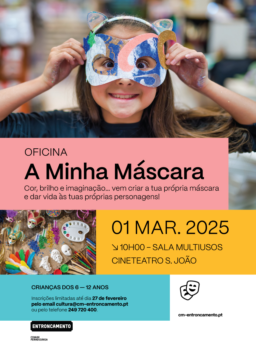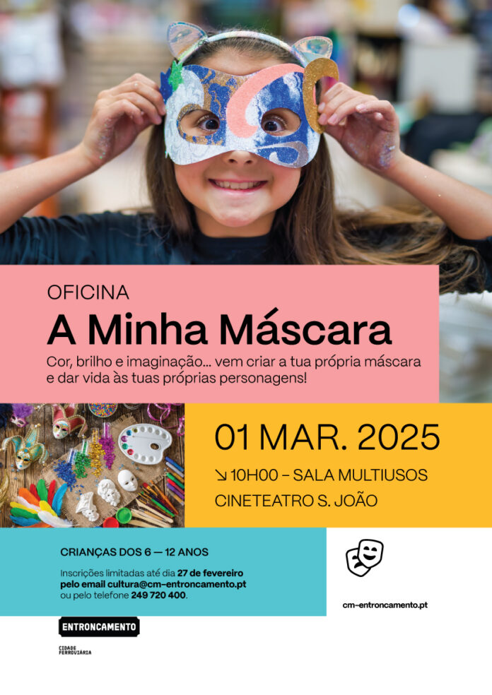 A Sala Multiusos, do Cineteatro São João, recebe no dia 1 de março, sábado, pelas 10h00, a Oficina – A Minha Máscara, dirigida a crianças dos 6 aos 12 anos.