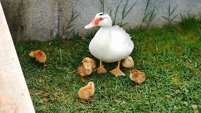 E o resultado foram seis robustos pintainhos que a mãe pata assume e cuida como se fossem dela.