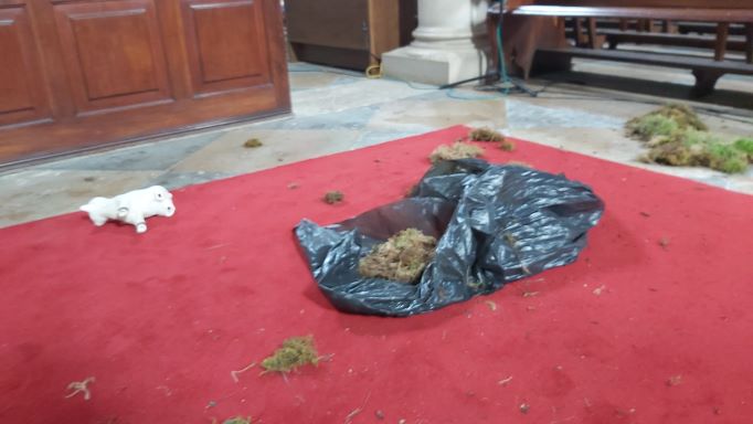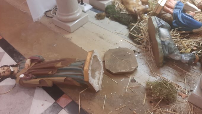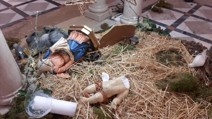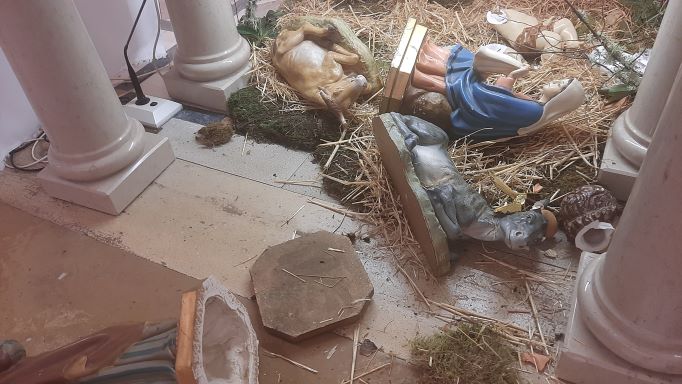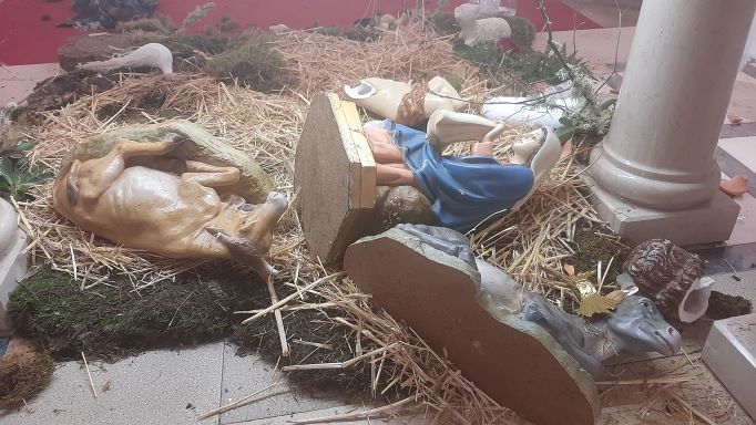 As várias imagens que compunham o presépio da Igreja da Sagrada Família tinham um valor considerável. Foram pontapeadas e apedrejadas, ficando irremediavelmente destruídas. Parte do musgo foi removido e atirado em todas as direções. Três dos quatro recipientes de vidro contendo as velas do Advento foram também partidos. O altar da igreja foi profanado, havendo marcas de calçado na toalha que cobre o mesmo e tendo esta última sido rasgada.