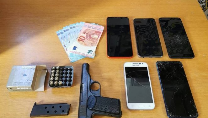 Ao detido foram apreendidos 170,00 € (cento e setenta euros) em notas do BCE, cinco telemóveis de diversas marcas e modelos, uma pistola de calibre 7,65mm, um carregador e onze munições 7,65mm.