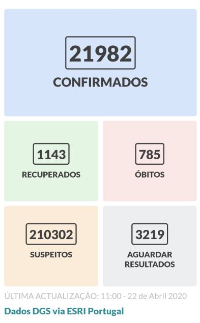A nível nacional o número de mortos subiu para 820, mais 35 do que ontem (anteriormente mais 23), os infetados são agora 22353 mais 371 que ontem (anteriormente mais 603) e os casos recuperados são agora 1201, mais 58.