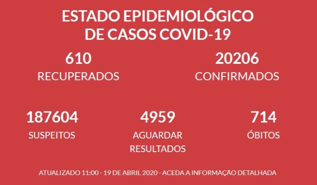 A nível nacional o número de mortos subiu para 714, mais 27 do que ontem (anteriormente mais 30), os infetados são agora 20206 mais 521 que ontem (anteriormente mais 663) e os casos recuperados mantém-se nos 610.