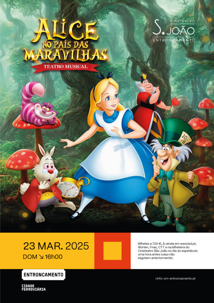 O Cineteatro São João recebe, no dia 23 de março, domingo, pelas 16h00, o Teatro Infantil “Alice no País das Maravilhas”.