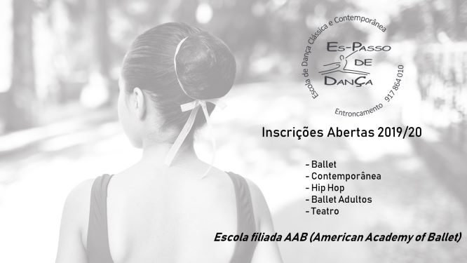 A escola Es-Passo de Dança já se encontra a receber inscrições de novos alunos para o próximo ano letivo 19/20. Podem inscrever-se em aulas de ballet (a partir dos 3 anos de idade), Ballet Adultos (+18), Hip Hop (a partir dos 6 anos), e aulas de Teatro (a partir dos 8 anos) esta última uma novidade da escola.