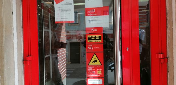 O acesso ao interior da Estação dos CTT no Entroncamento não tem regras. Na porta nem uma menção às novas regras. Uns dias os clientes fazem fila para entrar pela rampa, outros entram para tirar a senha e são mandados pelos funcionários esperar cá fora.