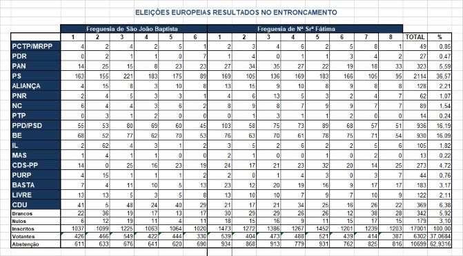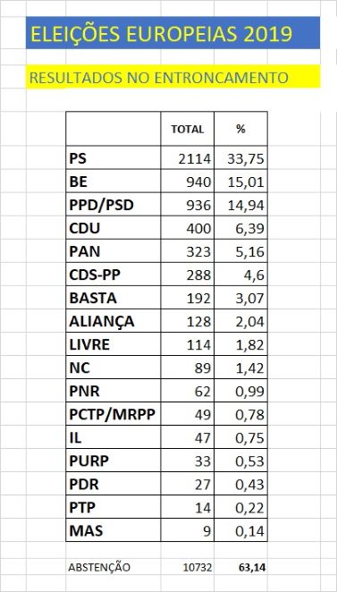 O Partido Socialista venceu as Eleições Europeias em Portugal com cerca de 33 %, percentagem que também obteve no Entroncamento (33,75%), onde o BE obteve o 2º lugar (15%) com mais 4 votos do que o PSD (14,94%).
