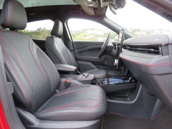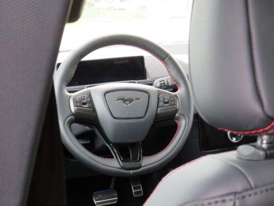 Por outro lado o design interior nada tem haver com o desportivo, pois é bastante minimalista. Talvez a única semelhança que encontro seja as saídas de ventilação junto das portas. E como se trata de um elétrico obviamente tem que ser tecnológico, e por isso temos um painel de instrumentos digital, que é pequeno para o que temos hoje em dia, mas que apresenta o essencial, ou seja, a velocidade e as ajudas à condução, pois tudo o resto estará presente no enorme ecrã central que se encontra ao alto, bem ao estilo da Tesla. O sistema de infotaiment a que temos acesso através deste ecrã é muito semelhante ao sistema presente em todos os Fords, mas com uma disposição vertical. Neste ecrã temos também presentes os botões para controlo da climatização, que na minha opinião deviam continuar físicos porque em andamento é mais complicado de operar, ainda para mais na posição muito baixa em que se encontram que nos faz desviar o olhar da estrada. A tê-los digital deveriam estar no topo do ecrã e não na base. A qualidade dos interiores é boa, especialmente para um Ford. Existem poucos plásticos e onde não temos pele, temos tecido a cobrir o tablier ou portas. No geral, para mim, o interior está muito bem conseguido à exceção dos bancos. Estes são confortáveis, mas têm um encosto muito neutro para um carro desportivo, o que nas curvas não nos encaixa bem.