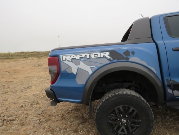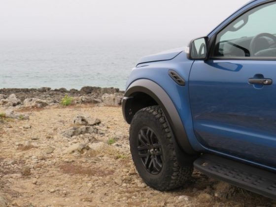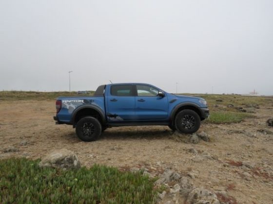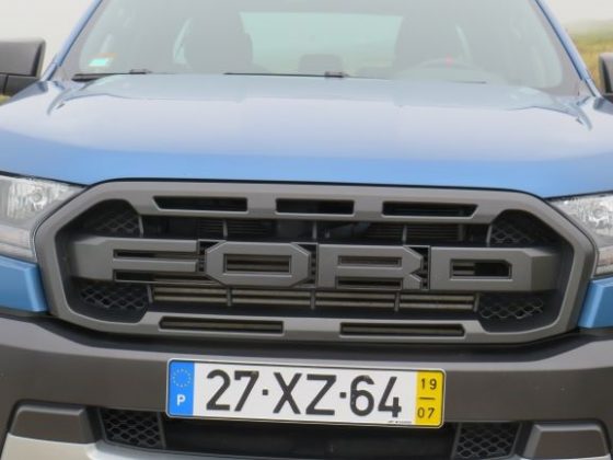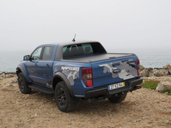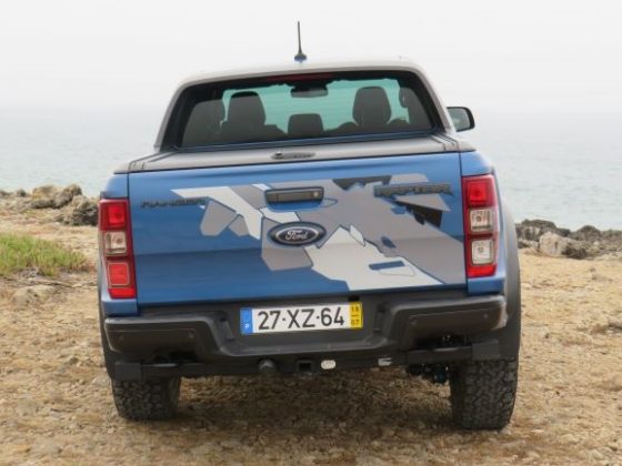 Na parte dianteira temos uma frente bastante imponente, alta e alargada relativamente os modelos normais da Ranger. Temos anda a típica grelha Raptor, que já conhecemos da pick-up americana F-150. Na parte lateral temos a verdadeira perceção da dimensão da Ranger Raptor (são 5 metros de pick-up), e conseguimos também ter noção da verdadeira dimensão dos pneus todo o terreno que “engolem” as jantes de 17”. A altura também é bastante evidente, mas ainda bem que temos um estribo para nos ajudar a subir, porque caso contrário seria difícil e impossível para alguém com pouca flexibilidade. Temos também uns autocolantes com a inscrição Raptor que são um extra de 1000€. A parte traseira já é mais simples, sendo que o único ponto de destaque é o autocolante (quando comprado).