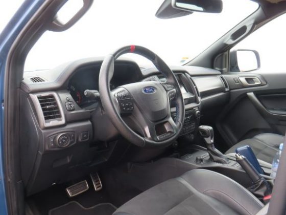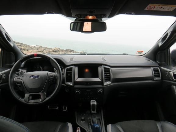 O design interior é bastante simples e americano, apenas temos que destacar uma qualidade de materiais um pouco melhor. No topo do tablier temos pele com efeito de pesponto azul, efeito esse que também está presente no volante. O volante é da Ford performance, e tem uma excelente pega e é acompanhado de umas patilhas de titânio. O volante tem ainda na sua base a inscrição Raptor e o indicador de centro a vermelho. Onde também temos a indicação Raptor é nas costas dos bancos desportivos que têm um apoio ótimo. No que toca à habitabilidade da cabine a Raptor é ótima em todos os lugares e não há muito a dizer. Trata-se de um carro alto, comprido e largo, pelo que qual seja o lugar onde nos sentemos, temos imenso espaço para as pernas, cabeça e ombros, se levarmos três pessoas nos bancos de trás. No que toca à capacidade de carga em bagagem é enorme também, o único senão é que se trata de uma caixa de pick-up, e a nossa bagagem vai acabar por “bailar”, a não ser que compremos uma rede de fixação.