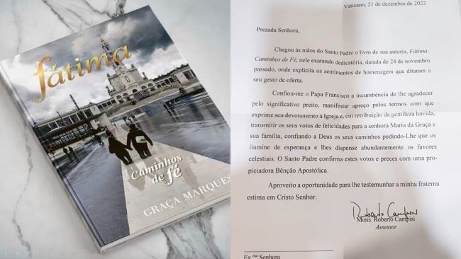 O livro de Graça Marques “Caminhos de Fé” chegou ao Papa Francisco, que de imediato enviou um agradecimento do Vaticano a agradecer; “Parabéns Sra. Graça Marques… é certamente um orgulho e uma bênção para si, mas é-o também para todos nós.”