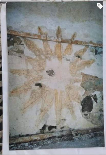 Uma pintura com a estrela de Belém da natividade e os contornos de uma estalagem? Parece, A estrela de vergina como inspiração? Talvez. É esta a opinião de um pintor/ restaurador com quem falei.